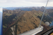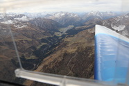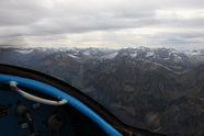Ab nach Füssen, Falkenfüttern mit Mogas, blaue Falkenschuhe anziehen und ab gehts, Kurs West, prächtig. Ja, in Hohenems seh ich das herannahende Wetter schon deutlich stehen und das passt genau, ich dreh vorm Wetter um und fliege ihm davon. Wahnsinnsgegend hier, ein wirklich toller Teil unseres Landes, ich mein, Triebwerksausfall wünsch ich mir da keinen, die Landemöglichkeiten beschränken sich unter das berühmte Minimum, es gibt da zeitweise garnix was auch nur im entferntesten land-bar aussieht. Deutlicher Wind aus Südwest, also fliege ich an den Südhängen entlang, ich bin fast 10.000 ft und nicht wirklich über den Bergrücken, ein Saufen in den engen Tälern kann ich da garnet brauchen.
