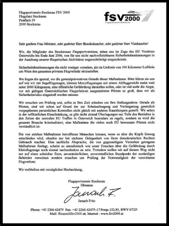 | Liebe Mitglieder! Als größter Flugsportverein im Nordosten Wiens sind wir nicht nur in der Sache, dem Flugverbot während der EU Treffen, sondern auch von der uns unterstellten kriminellen Energie betroffen. Ich denke es ist nicht sinnvoll immer zu schweigen und die getroffenen Maßnahmen unwidersprochen hinunter zu schlucken. Mündigen Menschen denen sehr wohl zugemutet wird viele in ihrer Sinnhaftigkeit anzweifelbaren Maßnahmen zu akzeptieren, FCL, FTO, Medical, und dafür auch noch viel Geld zu bezahlen werden hier in einer Weise am Fliegen gehindert die nicht zu akzeptieren ist. Sind wir alle ein Haufen krimineller Terroristen die die Staatssicherheit gefährden? Ein Verein mit mehr als 400 Mitgliedern der eine hochanspruchsvolle Tätigkeit sicher zuverlässig und gemeinnützig im Einvernehmen mit den Kommunen wahrnimmt wird durch die "Hohe Politik" in ein Licht gerückt in dem wir uns sicher nicht sehen. Daher habe ich das beiliegende Schreiben als Zeichen unseres Unverständnisses an den Bundeskanzler sowie an die zuständigen Minister übermittelt. Nicht um patzig unser Unverständnis darzulegen sondern viel mehr um zu versuchen in Zukunft über das Gespräch mit den Betroffenen direkt zweckmäßige Lösungen zu finden. Fritz ![]() |