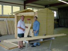| Heute: Unser Verpflegungsstand Wolfgang Gockert, Schorschi Pohl und auch einige andere gute Geister schraubten, hämmerten und nagelten, was das Zeug hielt, damit diese wunderschöne Gastronomie-Hütte rechtzeitig Ihre Bestimmung aufnehmen kann. Am Fest wird es neben (natürlich) Fassbier und allen sonstigen Getränken auch noch Bratwürstel, Grillhendl und Frankfurter geben. |