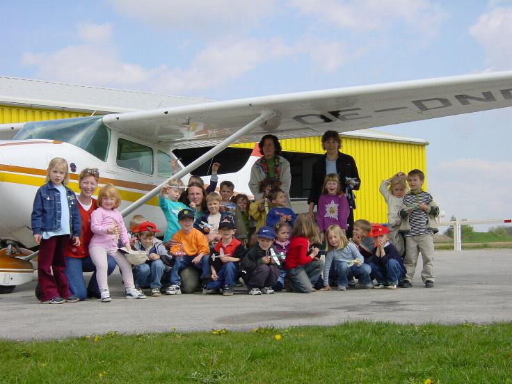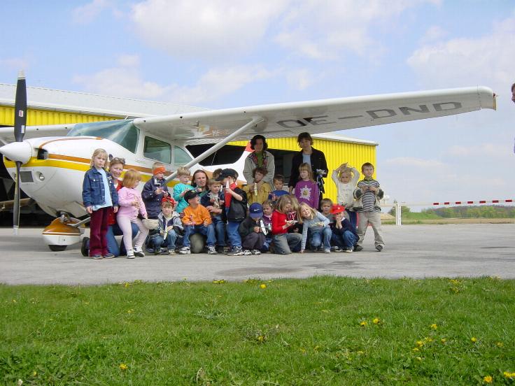 | Am 23.4.2002 besuchte uns die 1a-Klasse (Volksschule) der De La Salle Schule Strebersdorf. In Begleitung ihres Klassenlehrers, Herrn Schulrat Alfred Klinger und der Erzieherin, Frau Sabine Prochaska, besichtigten 25 Buben und Mädchen unseren Flugplatz. Zu Beginn der Besichtigung wurde unsere OE-DYU, eine Cessna 172, von den Schülern "erobert". Mit Begeisterung wurden Quer- und Höhenruder betätigt, Landeklappen ausgefahren und die Trimmung betätigt. Und natürlich wurde viel gefragt. Nach einer einfachen, eben dem Alter der Kinder entsprechenden Einführung in die "Geheimnisse" der Fliegerei wurde mit Begeisterung der Start einer Cessna 150 beobachtet. Da sich hiermit ein Flugschüler in die Platzrunde zum Üben begab, konnte man Starts und Landungen in kurzen Abständen sehen. Anschließend begab man sich zum Hubschrauber Bell 206 Jet – Ranger der Firma Aerial und besichtigte diesen eingehend. Hier entstanden auch die Fotos. Hungrig geworden freuten sich die kleinen Besucher auf die Verköstigung in der Kantine, wo sie von unseren Pohls liebevoll betreut wurden. Nach der Jause ging es kurz in den Lehrsaal mit Besichtigung des Flugsimulators. Wie es sich für den Besuch eines Aerodromes gehört, verging die Zeit mit unseren Besuchern "wie im Flug" und es wurde Zeit für den Abschied - mit dem Versprechen des Klassenlehrers, uns, wenn die Kinder in der vierten Klasse sein werden, wieder zu besuchen. Betreut wurden unsere Gäste von Helmut Harringer unter Mithilfe seines Sohnes Daniel, der selbst ein Schüler der 1a ist. |