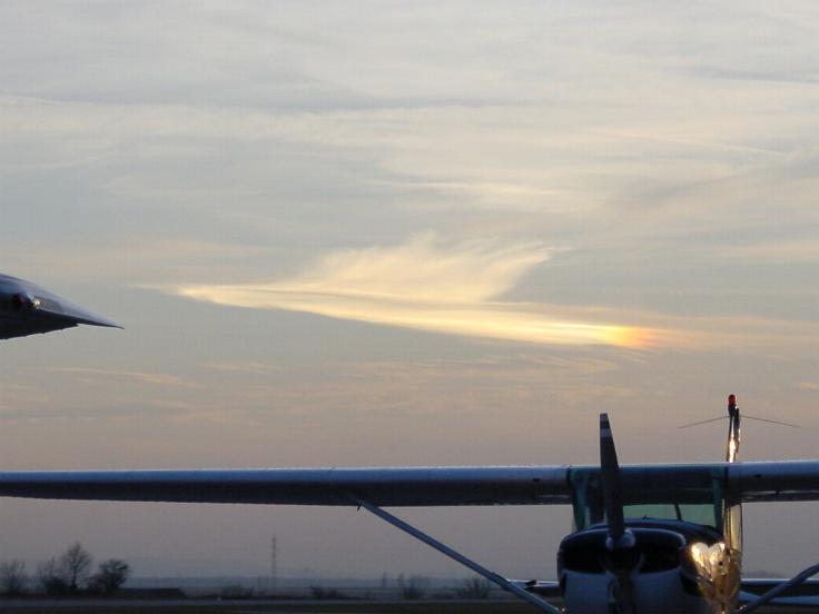 | Schon vor einiger Zeit habe ich eine interessante Abendstimmung eingefangen, -- himmlischer Vogel über "blecherner Cessna" -- Anm. d. Red: |
