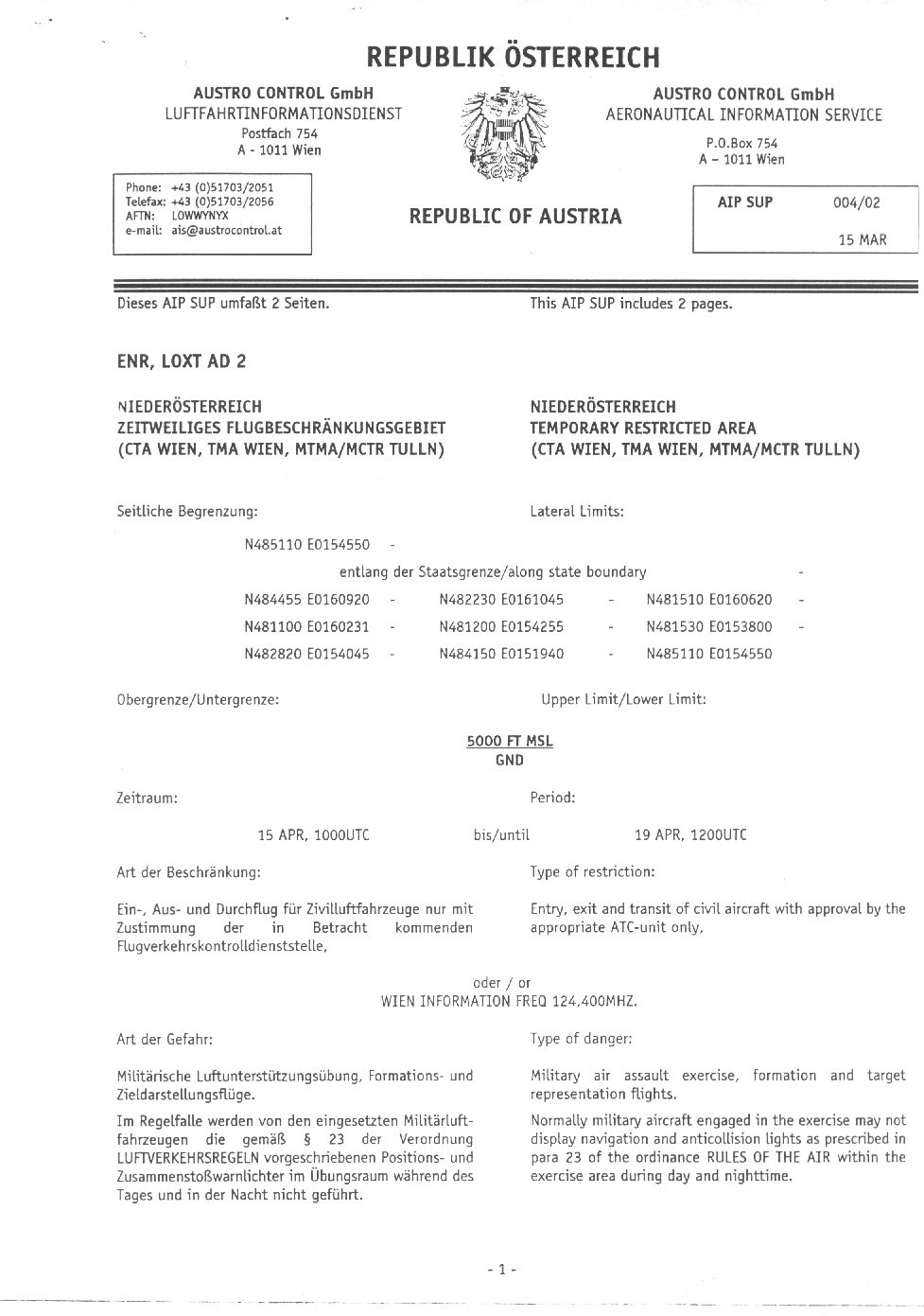 | TEMPORÄRES FLUGBESCHRÄNKUNGSGEBIET "NIEDERÖSTERREICH" - Nächste Woche ab Montag den 15.04.2002 gibt es ein TEMPORÄRES BESCHRÄNKUNGS-GEBIET. Hiervon ist LOAU unmittelbar betroffen! Aufgrund der Militärübungen bei Retz wurde nunmehr ein temporäres Flugbeschränkungsgebiet für militärische Zwecke erlassen. Dieses gilt von Montag 15.04.2002 1000 UTC bis 19.04.2002 1200 UTC. Genaueres findet Ihr in AIP SUP 004/02. Näheres findest Du auf diesen beiden AIP-SUP 004/02 Seite 1 und 2: Weiters den Aushang im Wordformat |