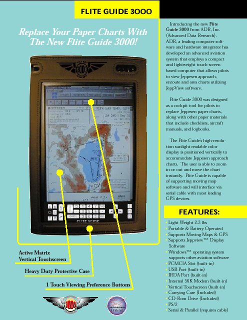 | Für alle, die es schon immer gehasst haben, die Jeppesen Ergänzungslieferungen der diversen Updates einzusortieren (oder es sogar vergessen haben), gibt es seit kurzer Zeit 2 neue Produkte. Dies sind das Northstar 1000 und Flite Guide 3000. Ich habe beide getestet und mich für das Flite Guide 3000 entschieden. Dabei handelt es sich um ein kleines, aber feines Notebook mit allen Anschlüssen und Touchscreen (beschrieben auf www.edmo.com und lt. Beilage). | |||