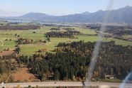 Vogtareuth Füssen verläuft problemlos, Wunderbarer Flugplatz direkt am Fuße der bayrischen Königsschlösser. Im Endanflug 08 rekapituliere ich nochmals die Anfluginfo am Blattl: "1000*60 mtr. Gras, davon 450mtr. nutzbar, TO/LDG auf der Südseite der Bahn, auf oder nahe am Asphaltstreifen".